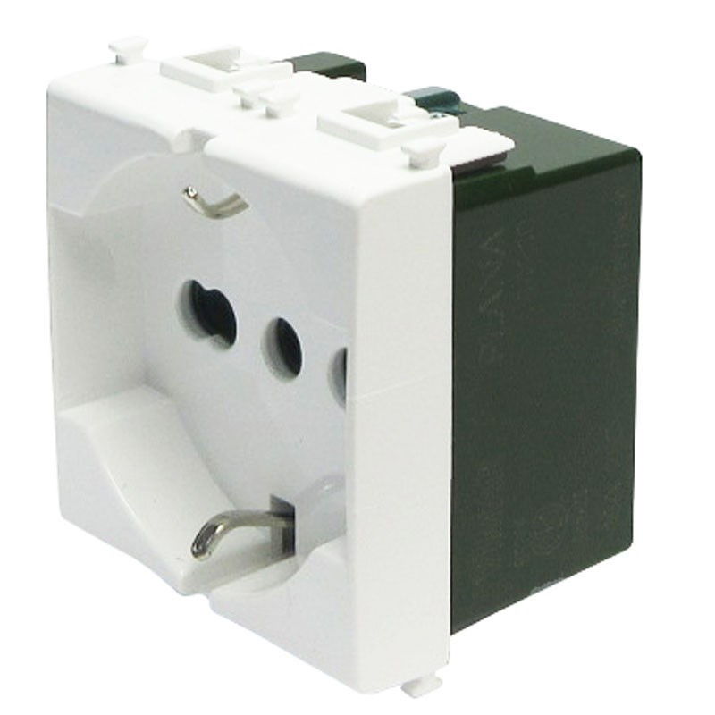 Presa elettrica schuko universale Vimar 2P+T 16A 250V frequenza 50,00 - 60,00 HZ, colore bianco. La presa elettrica schuko detta anche presa Tedesca permette di inserire al suo interno qualsiasi spina (piccola,grande e schuko). Capienza 2 moduli, grado di protezione IP20. Materiale plastica. Dimensioni: larghezza 44,80 mm, altezza 49,00 mm, profondità 25,00 mm.